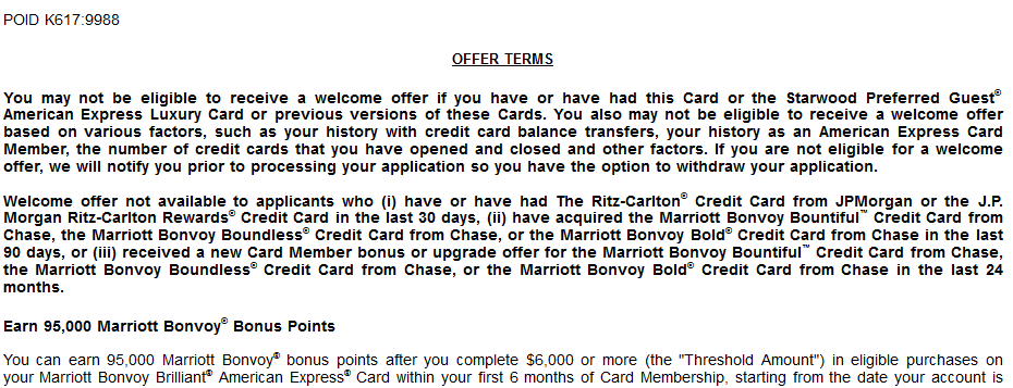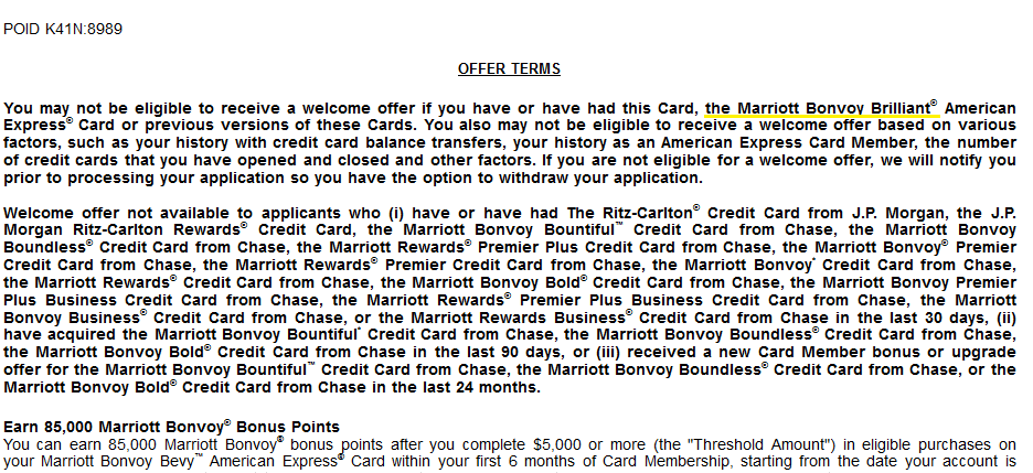 Frequent Miler has made a chart regarding to Marriott’s confusing credit card signup bonus eligibility, and they’ve also pointed out the previous Offer Terms for the Bevy, which lacked the wording that includes the Bonvoy Brilliant.