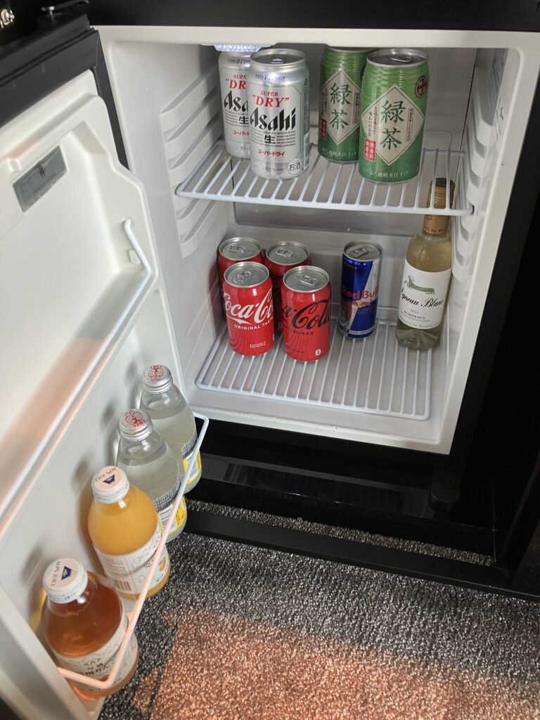 Just behind the entryway is the pantry, seating area, and a vanity desk. Pantry includes a tea set, Nespresso machine, and complimentary water replenished daily. Housekeeping would also add senbei (rice crackers) for snacks after they’ve cleaned up your room.